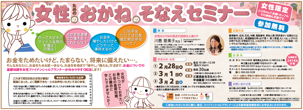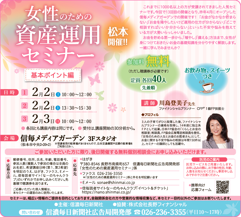2月1日(日)~2月3日(火)の3日間、長野「信濃毎日新聞社」にて「お金のそなえセミナー」の講師を務めました。